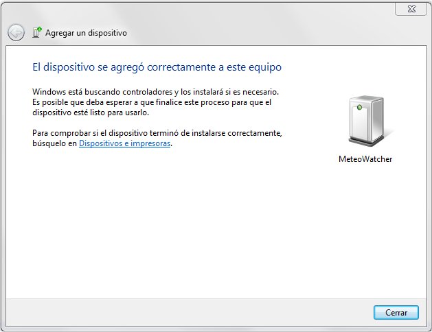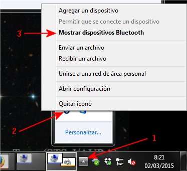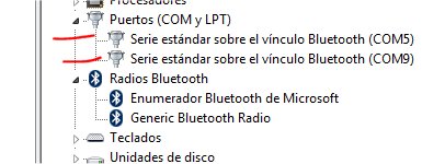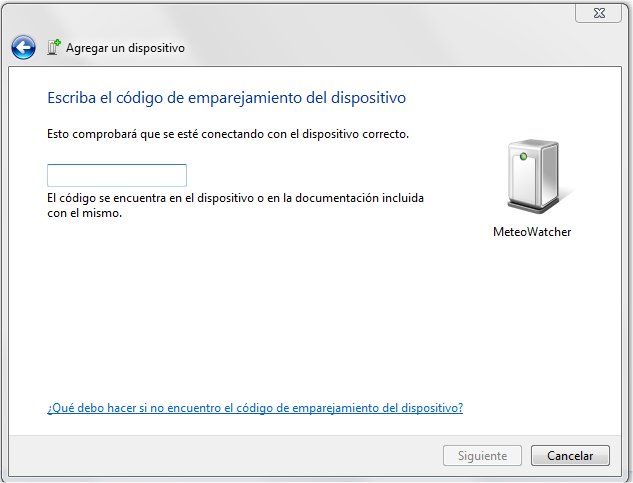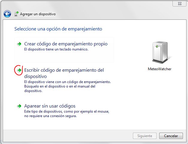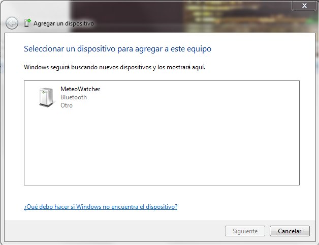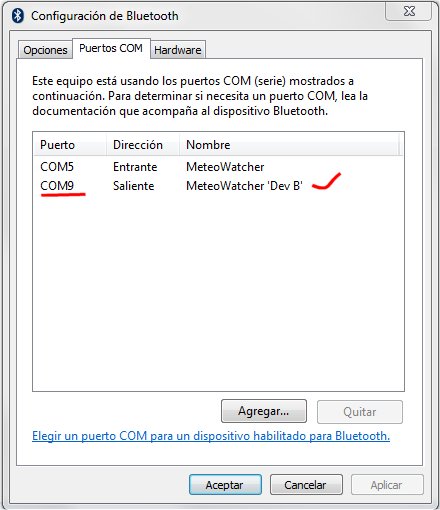 invertir la polaridad. Acto seguido, conforme se muestra en la imagen, iremos a la esquina inferior derecha de la pantalla, pulsaremos botón izquierdo del ratón donde indica 1. Aparecerá una pequeña ventana en la que deberemos ver el icono representativo de Bluetooth. Pulsaremos sobre él con el botón izquierdo del ratón como se indica en 2. Aparecerá una nueva ventana de opciones y seleccionaremos Mostrar dispositivos Bluetooth con el botón izquierdo del ratón como se indica en 3. Entonces aparecerá la siguiente ventana: Seleccionaremos en Agregar dispositivos. Puede que tengamos que esperar unos instantes hasta que se identifique al MeteoWatcher, pero finalmente obtendremos: Seleccionamos MeteoWatcher y pulsamos Siguiente, apareciendo la siguiente ventana de opciones: Seleccionaremos Escribir código de emparejamiento del dispositivo. En el recuadro escribiremos el código PIN del MeteoWatcher: 1234 y pulsaremos Siguiente. Podemos pulsar el botón de Cerrar, pues ya hemos finalizado el proceso de vinculación. De manera automática Windows comenzará a instalar los drivers de MeteoWatcher, que son serán dos puertos COM. Una vez que finalice tendremos: Podemos cerrar la venta, y en Administrador de dispositivos (ejecutando devmgmt.msc), si todo ha ido correctamente, tendremos: En este caso se han identificado como COM5 y COM9. No intente cambiar el número del puerto COM asignado, pues en ocasiones genera problemas. Como se ha visto, Bluetooth define dos dispositivos COM. Utilizaremos para establecer la comunicación el destinado a tráfico saliente, que será el que habrá que configurar en el programa del MeteoWatcher. Para ello, abriremos nuevamente el gestor de conexiones Bluetooth y seleccionaremos Abrir configuración: Pulsando en la pestaña Puertos COM obtendremos: Para dialogar con MeteoWatcher deberemos seleccionar el COM9, pues es el que el gestor de Bluetooth ha etiquetado como Dev B. Pulsamos Aceptar y ya podemos iniciar el programa de control del MeteoWatcher, sabiendo que debemos configurar el COM9 como puerto de comunicaciones. Bajo ciertas circunstancias el gestor de Bluetooth puede intercambiar el papel de estos dos puertos COM, por lo que si tenemos problemas de conectividad será conveniente verificar el paso previo. |