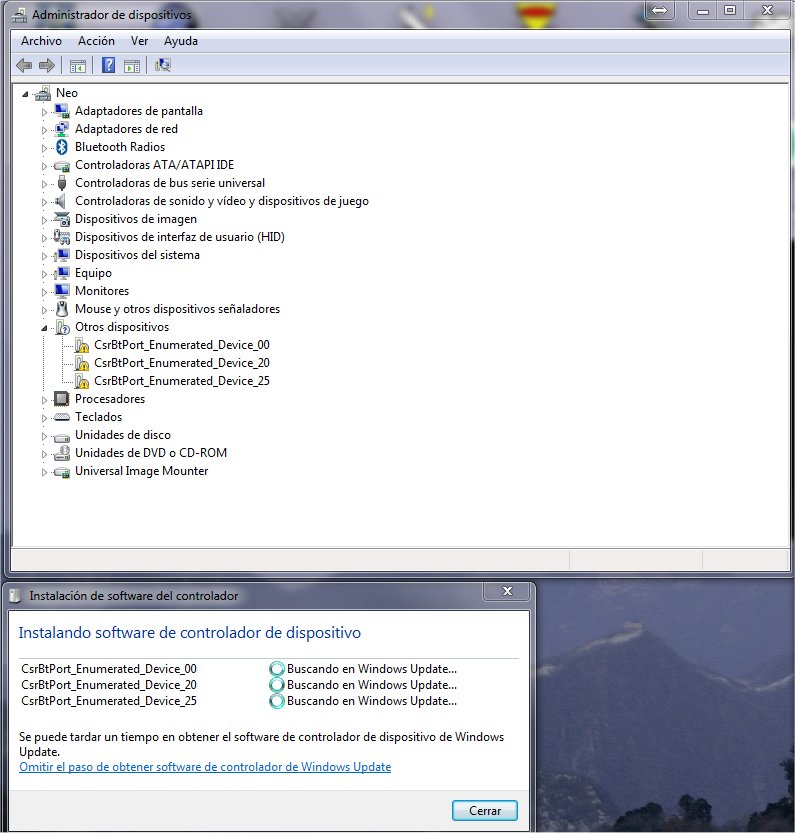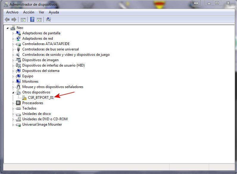 Lo primero que habrá que hacer, antes de conectar el adaptador USB Bluetooth es instalar los que se incluyen en el miniCD. Se ejecuta el programa Setup.exe, dejando que se instalen las opciones por defecto. Tardará unos minutos. Inmediatamente después de conectar el dispositivo, el Administrador de dispositivos indicará: