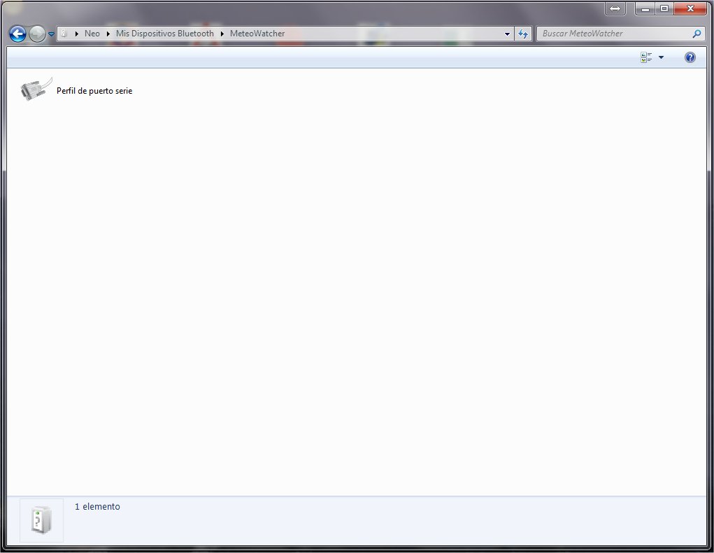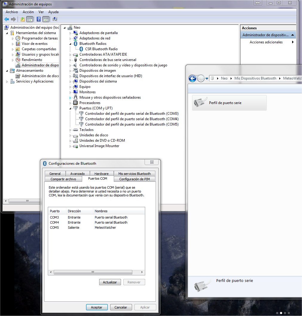 Seleccionaremos Perfil de puerto serie con el botón derecho del ratón e indicaremos Crear puerto. Una vez creado este nuevo puerto serie (en este caso COM5), y si miramos en Configuraciones de Bluetooth / Puertos COM, veremos que este puerto figura como Saliente y vinculado con el MeteoWatcher.