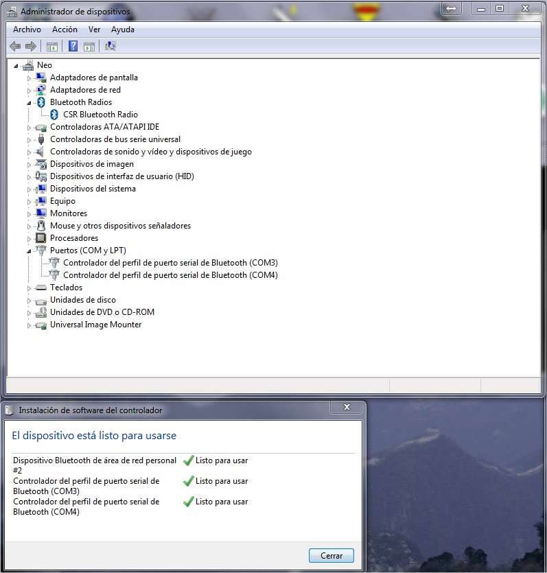 Como puede verse, el instalador crea dos puertos COM, en este caso COM3 y COM4, que en el caso de otro tipo de dispositivos utilizará para recibir peticiones de conexión. Estos todavía no son los que utilizaremos para dialogar con el Meteo Watcher. Con lo que ya hemos terminado correctamente la fase de instalación del interfaz de dispositivos Bluetooth. |