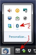 Una vez cerrada la ventana anterior, procederemos a habilitar definitivamente nuestros Meteo Watcher, creando el puerto serie que nos permitirá dialogar con él. Para ello, conforme se muestra en la imagen, iremos a la esquina inferior derecha de la pantalla, pulsaremos botón izquierdo del ratón donde indica 1. Aparecerá una pequeña ventana en la que deberemos ver el icono representativo de Bluetooth. Pulsaremos sobre él con el botón izquierdo del ratón como se indica en 2. Aparecerá una nueva ventana de opciones y seleccionaremos Mostrar dispositivos Bluetooth con el botón izquierdo del ratón.