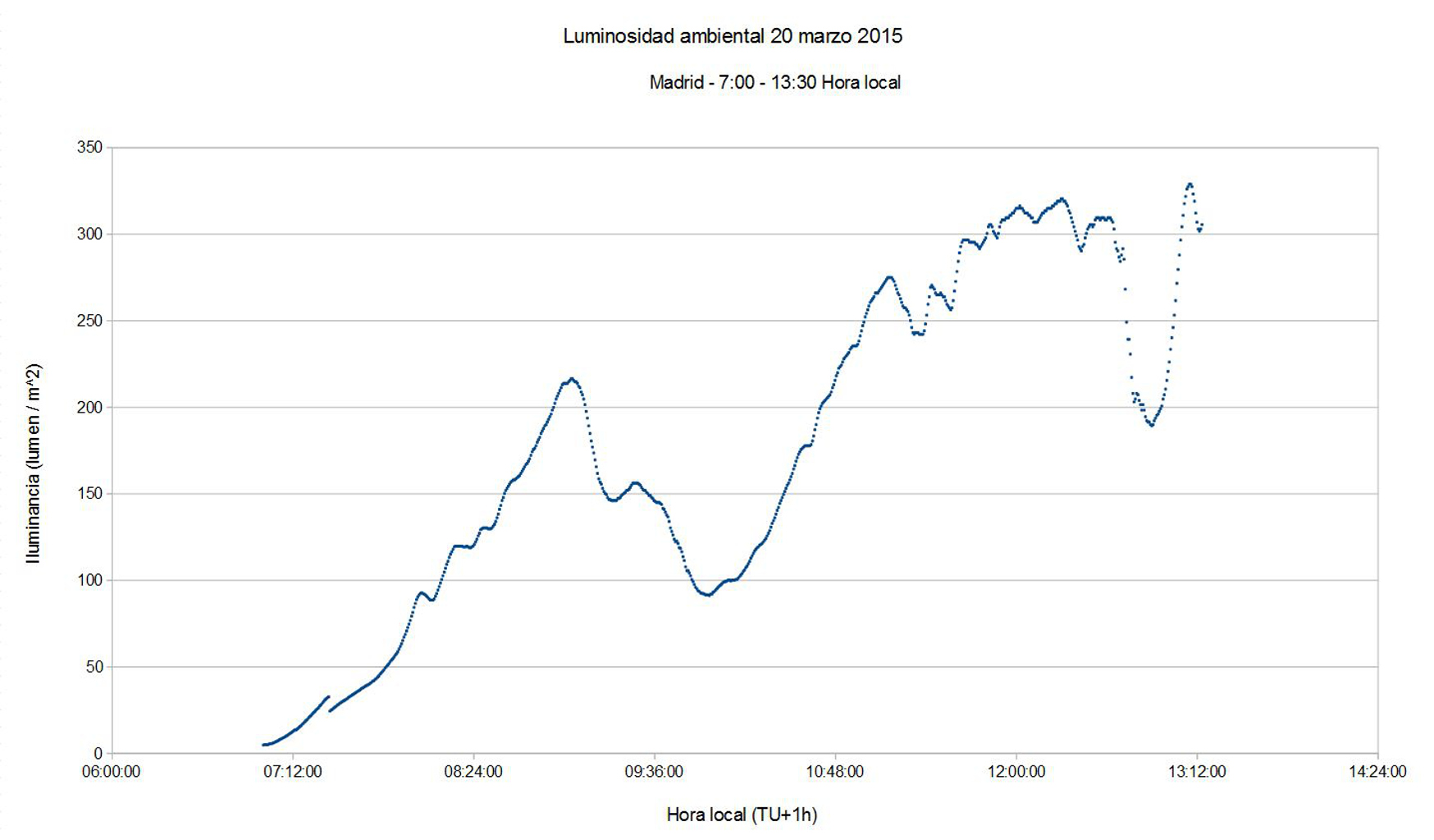 interesante publicarla aquí. Miguel Rodríguez utilizó el sensor de luz del Meteo Watcher para monitorizar el eclipse parcial de Sol que tuvimos el pasado 20/MAR/2015. Con la información almacenada en el fichero de telemetrías en formato csv ha obtenido esta magnífica gráfica, donde puede verse con total nitidez la variación de luminosidad medida durante el eclipse.