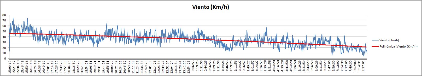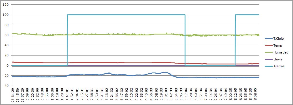 Ejemplo 1 Puede descargar el fichero MeteoWatcher-20141219-215638.csv que corresponde a un caso real, en donde fue imposible abrir el observatorio. Los ficheros CSV los puede abrir directamente con Excel, puediendo elaborar resultados gráficos con los datos registrados. El día anterior estuvo lloviendo casi 24 horas seguidas. Al inicio de la sesión (21:56) había abundante niebla, el observatorio estaba tan empapado que hasta el sensor de lluvia detectaba esta circunstancia. Según avanzaba la noche la humedad relativa fue subiendo, llegando a superar el umbral límite (establecido por mi) del 80% a las 22:19. La niebla iba levantando y la temperatura del cielo cada vez era menor, es decir, iba despejando. A las 23:20 el cielo entra en zona de Despejado (< -22ºC), todo está correcto, salvo que la humedad relativa está por encima del 80%. Unos minutos más tarde el cielo vuelve a cubrirse con niebla y la humedad relativa va subiendo poco a poco. Sobre las 01:15 la temperatura de rocío sube y comienza a producirse abundante rocío, por lo que el sensor de lluvia entra en zona de Mojado. La cantidad de rocío sigue aumentando hasta el punto que a las 01:54 entra en zona de Lluvia. A las 03:10 se retira la niebla, pero la humedad relativa es alta y el rocío lo moja todo. En estas circunstancias es posible que la lente pudiese aguantar seca en caso de disponer de cinta calefactora, pero tendríamos el resto del material cubierto de agua. A lo largo de la noche se mantienen estas condiciones, hasta que la temperatura ambiente y el punto de rocío se distancian, gracias a que la humedad relativa baja, y el sensor de lluvia comienza a secarse. Sobre las 07:52 comienza a clarear, el sensor de lluvia ya está en zona de Mojado, hasta que con el calor del Sol termina por secarse totalmente. Ejemplo 2 Un ejemplo de noche donde todo empieza bien, a media noche se nubla y posteriormente vuelve a despejarse: MeteoWatcher-20141226-233410.csv. La gráfica adjunta es una visualización de los principales parámetros de esa sesión. Con el fin de facilitar la visualización se ha realizado un reescalado del relé de Apertura, al que se le ha multiplicado por 100. Como puede apreciarse, la sesión comienza sin problemas. A las 01:42 el cielo pasa a estar Nuboso, por lo que se dispara el relé de Apertura y se da orden de cerrar el observatorio. A las 5:45 el cielo vuelve a Despejado y 30 minutos más tarde (Tiempo de Rearme) se desactiva el relé de Apertura y se permite la apertura del observatorio. Hasta que a las 08:12 (amanecer), por exceso de luz se vuelve a disparar el relé de Apertura y se cierra el observatorio. Ejemplo 3 Las previsiones meteorológicas indicaban que la noche del 30 al 31 de Enero de 2015 tendríamos fuertes viento, frío, lluvia y hasta posibilidad de nieve. Lo que parecían las circunstancias ideales para probar la versión del Meteo Watcher con anemómetro. En MeteoWatcher-20150130-150855.csv tenéis más de 17 horas continuas de seguimiento de las condiciones medioambientales, nada propicias para abrir el observatorio. Y ésta es la gráfica obtenida con las telemetrías de la velocidad del viento: Recordad que la velocidad del viento que se proporciona es la media de las tres últimas mediciones, por lo que se ve muy amortiguado el efecto de las ráfagas. |