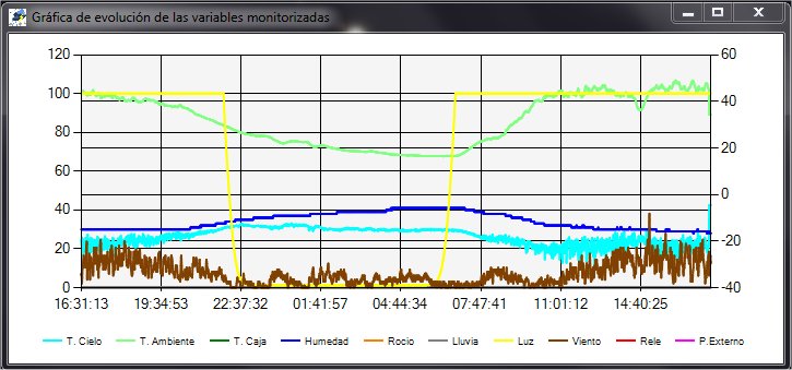 En el caso de que la ventana permanezca abierta, ésta se actualizará automáticamente cada 5 minutos. Si se pulsa el botón Gráfica estando la ventana abierta se producirá un refresco de las gráficas a ese instante. Cuando se abre la ventana de gráficos, o cuando ésta se regenera automáticamente cada cinco minutos, se crea/actualiza automáticamente el fichero MeteoWatcher.jpg con una copia de dicha gráfica. Los valores de Humedad, Lluvia, Luz, Relé y P. Externo se visualizan en una escala comprendida entre 0 y 100, por lo que utilizan el eje de ordenadas (Y) de la izquierda. Los valores de T. Cielo, T. Ambiente, T. Caja, Rocío y Viento utilizan el eje de ordenadas (Y) de la derecha. Los datos visualizados son los mismos que se almacenan en formato CSV, por lo que para estudios más profundos y detallados recomiendo utilizar directamente una hoja de cálculo. |