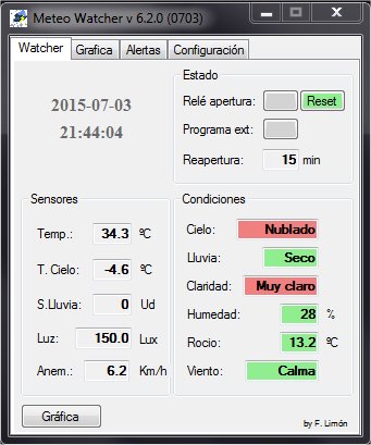 Meteo Watcher es un monitor meteorológico, diseñado para controlar la seguridad del observatorio mientras está operativo, ya sea gestionado de manera presencial o remota. Es una herramienta especializada en parámetros climatológicos relevantes en astronomía: Nubosidad, Temperatura ambiente, Humedad, Punto de Rocío, Luminosidad, Lluvia y Viento. Meteo Watcher no es una estación meteorológica, pues no cumple con los estándares que éstas requieren y no debiera usarse para tal fin. |