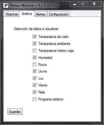 Como se ha indicado previamente, Meteo Watcher puede mostrar de modo gráfico todos los parámetros que monitoriza. En la ventana Grafica podemos seleccionar qué parámetros queremos que se muestren gráficamente. |