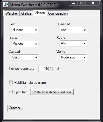 sensores y condiciones climatológicas que Meteo Watcher monitoriza. En la zona superior izquierda se muestra la fecha y hora en la que se realizó la última actualización de datos. En la zona superior derecha se muestra el estado de Relé de apertura, con el que se indica si las condiciones ambientales son adecuadas para operar el observatorio (botón en color verde) y por tanto el relé estará inactivo, o si por el contrario no se cumplen las condiciones para operar de manera segura (botón en color rojo) y el relé en este caso estará activo. En el caso de haberse inhibido el relé, el botón aparecerá en color gris. Además del relé, es posible configurar Meteo Watcher para que ejecute un Programa externo (*.bat, *.exe o *.vbs) en el caso de que las condiciones ambientales no sea adecuadas. Al igual que con el Relé de apertura, el botón estará en verde si las condiciones son adecuadas y el programa no se ha ejecutado o se ha cumplido el periodo de tiempo de Reapertura , en rojo en caso de incidencia y por tanto haberse ejecutado el programa, o en gris en caso de no estar activa dicha opción. Primero se ejecutará el programa externo, y una vez finalizado, se armará el relé de cierre. Esto permite, por ejemplo, ejecutar un script VBS (POTH_Park_Telescope.vbs) que se conecta con el telescopio a través de POTH para dar la orden de aparcar el telescopio, y posteriormente mediante el relé, iniciar el cierre del observatorio. En el campo Reapertura se indican los minutos restantes para que todos los mecanismos de seguridad activados indiquen que es posible abrir el observatorio: relé o campos de Cierre del observatorio o Alerta del fichero MeteoWatcher.dat. Esta cuenta atrás se inicia en el momento en el que se desactivan todas las alarmas. El botón Reset permite indicar a Meteo Watcher que en el próximo ciclo, si las condiciones lo permiten, ponga a cero el contador de tiempo para la Reapertura . Cuando se pulsa el botón se pone en color rojo. Una vez se ha evaluado la petición, éste vuelve a ponerse en verde. Es de utilidad si estando inhibida la apertura del observatorio (Relé de apertura en rojo) modificamos algún valor en la configuración o en las alertas.