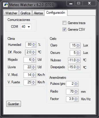 Con el fin de facilitar labores de depuración y análisis de datos, existen dos opciones adicionales: Genera traza: Se indica a Meteo Watcher que genere el fichero MeteoWatcher.log, en el mismo directorio donde se encuentre instalado, en el que irá almacenando toda la información relativa a las operaciones que va realizando. Normalmente estará desactivado. Genera CSV: Se indica a Meteo Watcher que almacene en el fichero MeteoWatcher.csv (ubicado en el mismo directorio donde se encuentre instalado) todos los valores leídos en formato CSV. Lo que permitirá analizar con una hoja de cálculo la evolución de los mismos y de este modo refinar el ajuste del sistema. Una vez ajustados los parámetros de configuración debe pulsar el botón Guardar para que se almacene en MeteoWatcher.ini la configuración establecida.