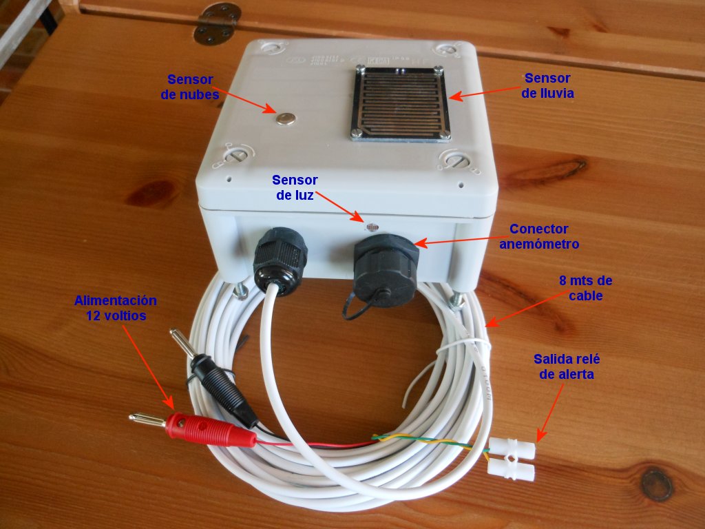 Algunas consideraciones sobre el sensor de lluvia y posibles falsos positivos. Es posible que bajo condiciones de humedad extrema se puedan obtener falsas lecturas de lluvia, al depositarse gran cantidad de agua sobre el sensor de lluvia. Incluso si la temperatura es muy baja este agua puede llegar a convertirse en escarcha o hielo. Algunos equipos incorporan sistemas calefactores que actúan sobre el sensor de lluvia, evaporando el agua que pudiera haberse depositado sobre él. El calor generado por el calefactor provoca una alteración en las medidas de humedad relativa y del dato del punto de rocío. El efecto provocado por el calefactor hace inviable la utilización de dichos parámetros a la hora de gestionar el observatorio. Lo que desde el punto de vista del autor de este diseño es un error. Por otra parte, resulta complicado imaginar una alerta de lluvia sin que previamente no haya saltado la alerta por nubosidad, sin contemplar sistemas de riego automático o similares. Estoy convencido que abrir el observatorio en condiciones extremas de humedad es un error, tanto por asumir riesgos innecesarios para la instalación como porque las observaciones en esas circunstancias no suelen ser satisfactorias. No obstante, si se decide abrir el observatorio en estas condiciones, existe la posibilidad en el Meteo Watcher de desactivar las alertas por lluvia y confiar en el sensor de nubes.