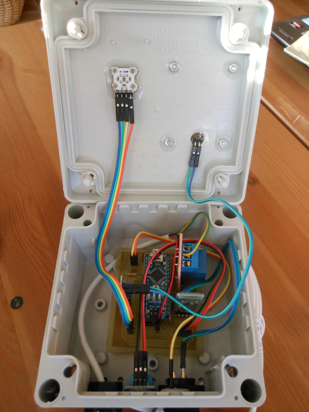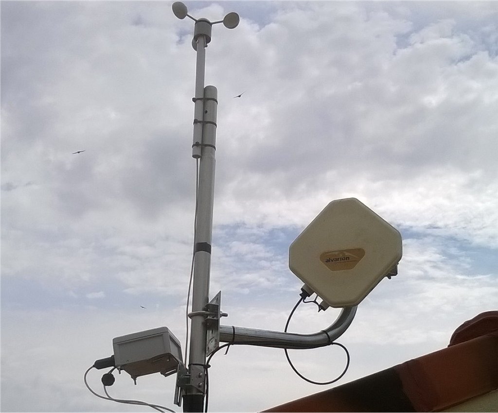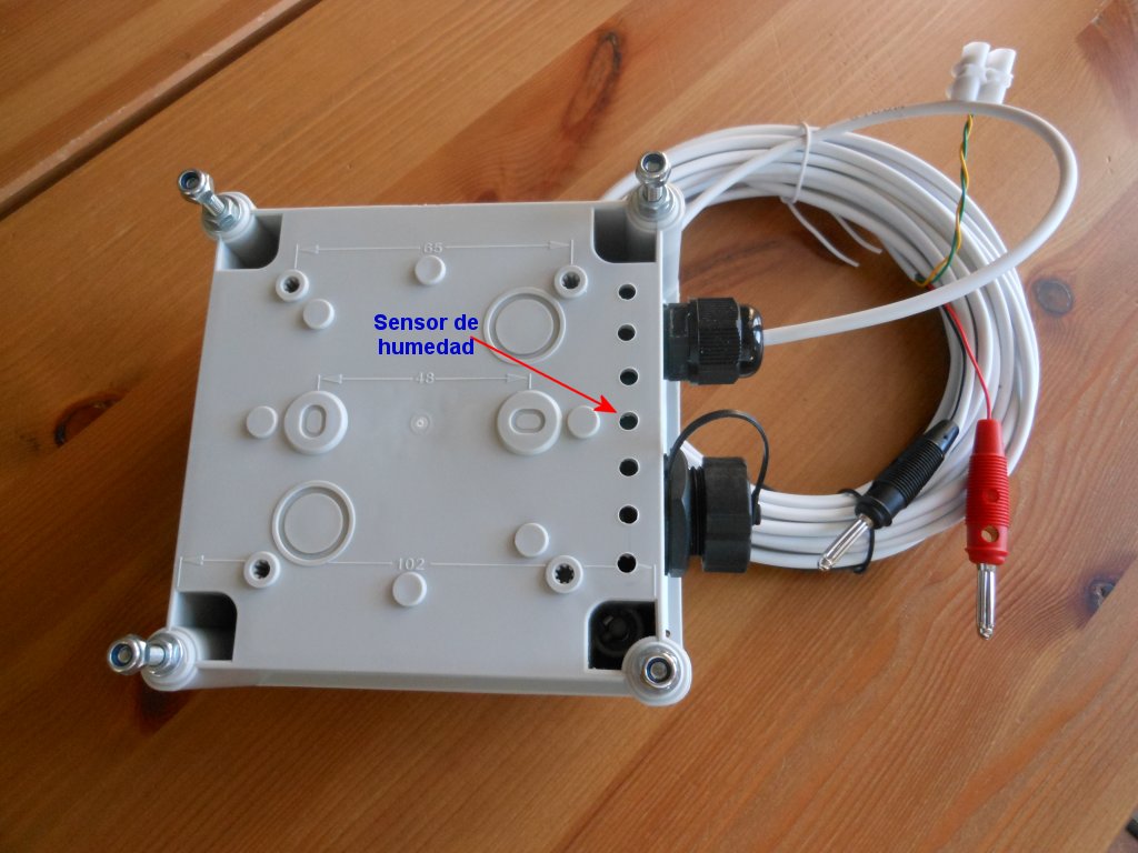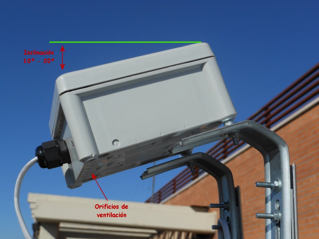 instalación. Descomprima el fichero MeteoWatcher-6.4.4.zip en el directorio donde decida ubicarlo. La clave de conexión como dispositivo Bluetooth es 1234. Si necesita ayuda para configurar el dispositivo Bluetooth pulse aquí. La primera vez que ejecute el programa MeteoWatcher.exe entrará directamente en el interfaz de configuración, donde se le sugerirán unos valores por defecto para todos los parámetros. Una vez ajustados los parámetros de configuración debe pulsar el botón Guardar para que se almacene en disco la configuración establecida. El dispositivo hardware Meteo Watcher deberá colocarse en una ubicación despejada del observatorio, aunque suficientemente cercana para que se mantenga el enlace Bluetooth, y observando una ligera inclinación para evitar se retenga agua en la parte superior del mismo, conforme se puede ver en la foto anterior. |